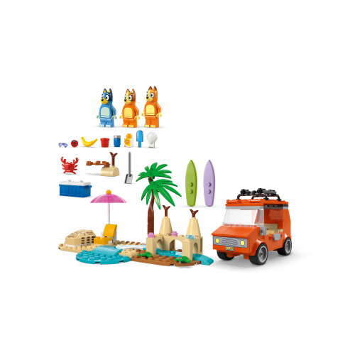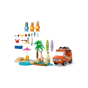 Interaktivní stavebnice pro děti – Tato zábavná stavebnice obsahuje minifigurky LEGO®, autíčko a spoustu kreativních aktivit pro zábavný den na pláži s Bluey, Bingo a jejich maminkou