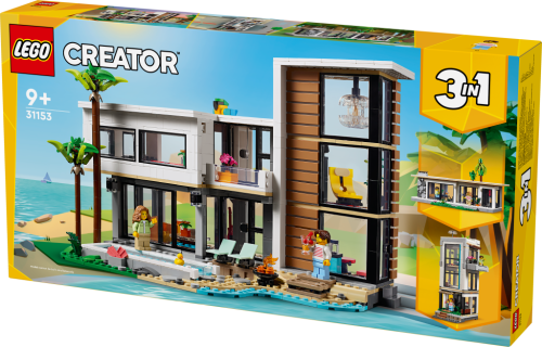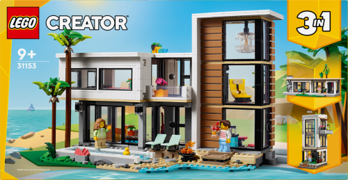 „Děti od 9 let se se stavebnicí Moderní dům (31153) vydají na průzkum 3 různých domů z kostek LEGO®. Luxusní 2patrový dům na pláži stojí ve stínu 2 palem a najdete v něm kuchyň, obývací pokoj, čítárnu, ložnici, sprchový kout, balkon a moderní nábytek včetně křesla a lustru. Součást je také bazén, který se stane součástí zábavných příběhů, které děti vymyslí. Tato stavebnice LEGO dětem přináší svět plný úžasných herních možností se 3 různými modely domů, které lze postavit ze stejné sady kostek. Děti si poskládají moderní dům, přestaví ho na stylovou 3patrovou městskou budovu s vířivkou a střešní terasou nebo ho promění v lesní chatu. Moderní dům a 3patrová městská budova umožňují přístup do pokojů zezadu a lesní chata má otevírací střechu. Stavebnice obsahuje 2 minifigurky a fanoušci LEGO jim mohou vyměňovat oblečení. Každý ze 3 modelů lze postavit s pomocí aplikace LEGO Builder a vychutnat si navíc zábavný digitální zážitek.“