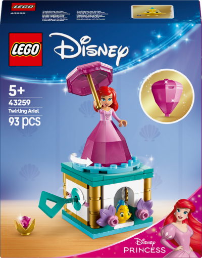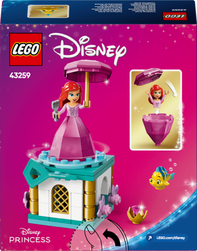 Potěšte holky a kluky od 5 let, kteří milují kreativní hraní, zábavnou stavebnicí Točící se Ariel inspirovanou filmem Malá mořská víla od studia Disney Stavebnice obsahuje stojan s otočnou podložkou a klíčem, minipanenku LEGO® Disney Ariel v měnících se „diamantových" šatech a figurku ryby LEGO Disney Šupinky Otočte klíčem na podstavci, roztočte podložku a Ariel a pak vložte minipanenku LEGO® Disney do „diamantových" šatů a deštník použijte jako víko Vystavte si stavebnici s Ariel, vidličkou a deštníkem, přidejte na podstavec Šupinku a „diamant" nebo si vymyslete nové příběhy s Ariel a Šupinkou
