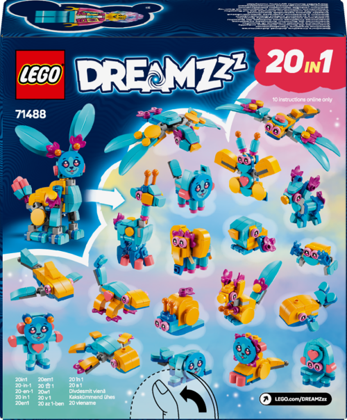 Vrhněte se do Světa snů se stavebnicí LEGO® DREAMZzz Bunchu a kreativní zvířecí dobrodružství pro holky a kluky od 7 let Hlavním modelem je figurka králíkaBunchu s pohyblivýma nohama, rukama, chodidly, ocasem a ušima Tato kreativní hračka přináší hned 19 alternativních možností přestavení a malí snílci si s ní užijí hodiny zábavy Další možnosti stavění – slon, šnek, žralok, krab, pták, ptáče, velryba, želva, žirafa, kočka, plyšový medvídek, veverka, lev, motýl, jelen, chameleon, vážka, tuleň a oliheň Stavebnice inspiruje ke kreativnímu hraní rolí a obsahuje hrdinku LEGO DREAMZzz Izzie v novém oblečení s plyšovým doplňkem