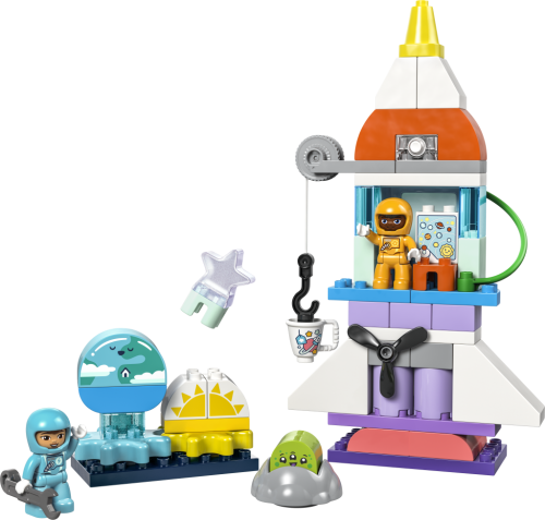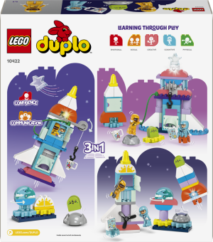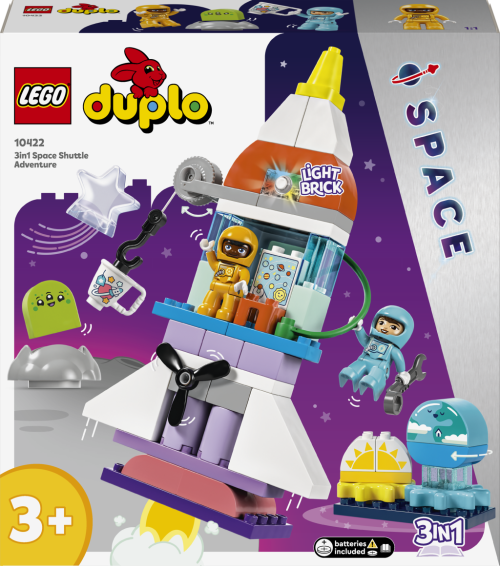 • Přestavitelný model raketoplánu – Potěšte malé astronauty od 3 let stavebnicí LEGO® DUPLO® Vesmírné dobrodružství s raketoplánem 3 v 1• Krabice plná zábavy – Součástí stavebnice je řada barevných kostek a doplňků ke hraní a figurka LEGO® DUPLO® mimozemšťana a 2 astronautů a děti se s ní vydají na nekonečná vesmírná dobrodružství• Hračka pro rozvoj dovedností – Děti při otáčení navijáku, roztáčení vrtule a otevírání dveří zdokonalí své jemné motorické schopnosti a při stavění vesmírných vozidel prohloubí kreativní myšlení• Součástí je světelná kostka – Zábavná světelná kostka (baterie jsou součástí balení) pozvedne vesmírnou stavebnici na zcela novou úroveň• Vesmírný dárek pro malé děti – Udělejte radost malým astronautům od 3 let a darujte jim vzdělávací hračku, která rozvíjí kreativní hraní příběhů• Kvalitní výrobek pro malé stavitele – Kostky a dílky z této stavebnice LEGO® DUPLO® raketoplánu pouštíme na zem, drtíme, kroutíme, zahříváme a analyzujeme, abychom zajistili, že splňují přísné normy týkající se bezpečnosti dětí• Podpořte dětskou zvídavost – Stavebnice LEGO® DUPLO® rozvíjejí klíčové dovednosti malých stavitelů a prohlubují jejich zájem o Zemi i o vesmír• Spousta kostek pro úžasné herní zážitky – Stavebnice se skládá z 58 dílků a součástí je model raketoplánu, který měří přes 35 cm na výšku, 18 cm na délku a 19 cm na šířku