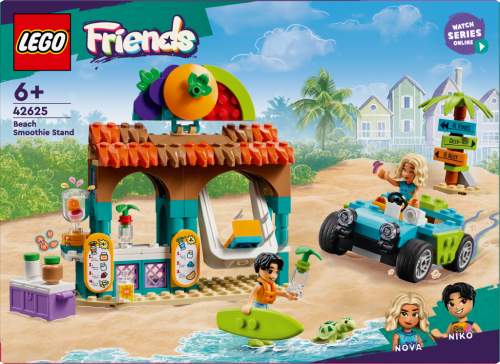 „Inspirujte děti ke kreativitě se stavebnicí LEGO® Friends (42625) Plážový stánek se smoothies pro děti od 6 let. Součástí stavebnice je model stánku se smoothies, plážová bugina a minipanenky LEGO Friends Nova a Niko. Děti zkombinují různé přísady, rozmixují je a vytvoří si smoothies různých příchutí. Povypráví příběh, ve kterém Nova s Nikem odpočívají s nápojem na houpačce a pak se vydávají prozkoumávat okolí v plážové bugině. Součástí této stavebnice LEGO je spousta doplňků, které podněcují kreativní hraní, včetně jídelního lístku, surfovacího prkna, záchranné vesty, autokamery a rozcestníku. Objevte další skvělé stavebnice (prodávají se samostatně) ze světa LEGO Friends plného příběhů s kamarády. Tato stavebnice je kompatibilní s aplikací LEGO Builder, která přináší intuitivní stavitelské dobrodružství. V ní mohou děti přibližovat a otáčet modely ve 3D, ukládat své stavebnice a sledovat svůj postup.“