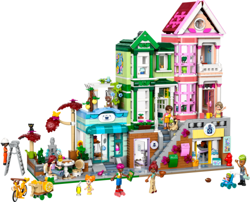 Stavebnice Apartmány a obchody v městečku Heartlake pro holky a kluky od 12 let obsahuje 3 barevné domy LEGO®, pekárnu, keramický ateliér a prádelnu Tatostavebnice je plná kreativních detailů, takže děti se můžou hrát a vymýšlet různé příběhy, než si model vystaví Apartmány jsou plné zábavných detailů, které jsou přizpůsobeny různým postavám, a najdete v nich spoustu místností a doplňků Na ulici najdetepekárnu, keramický ateliér s otočným hrnčířským kruhem a prádelnu s rolovacími dveřmi a 2 funkčními pračkami Součástí je 7 minipanenek, mikropanenka, figurka miminka, 3 figurky koček a řada doplňků pro kreativní hraní