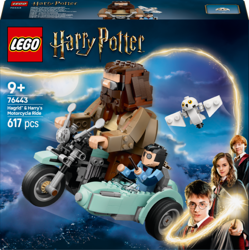 3 postavy LEGO® Harry Potter™ z kostek – Model obsahuje vestavěné pohyblivé figurky Harryho Pottera, Hedviky a Rubeuse Hagrida, kteří jedou na Hagridově létající motorce se sajdkárou