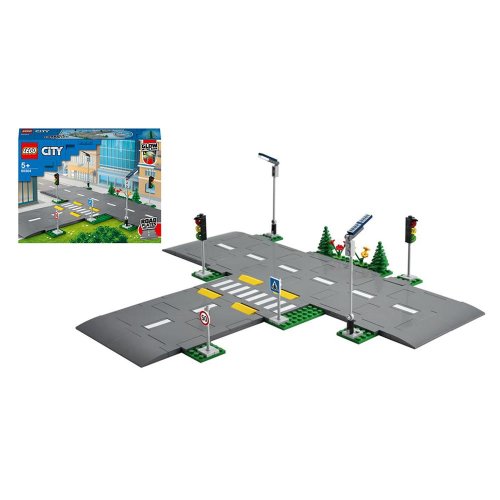 Silnice s pruhy, retardéry a přechodem. Navíc nechybí pouliční osvětlení, které ve tmě skutečně svítí, semafory, dopravní značky, stromy a zeleň Sestavená křižovatka měří přes 13 cm na výšku, 44 cm na šířku a 38 cm do hloubky