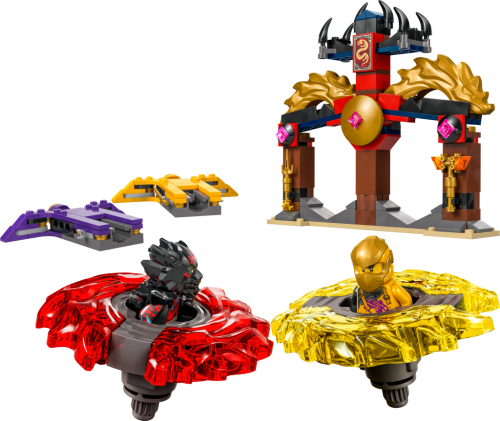 Holky a kluci od 6 let si se stavebnicí Bitevní balíček dračího Spinjitzu připomenou akční scény z 3. řady televizního seriálu NINJAGO Dračí povstání Děti umístí Arinův a Rasův dračí Spinjitzu spinner do odpalovacího zařízení a pak je vystřelí do napínavých soubojů proti sobě Arin a Ras vylepší své spinnery speciálními zlatými prvky, které vyhrají zasažením a zbořením bojové arény Tato stavebnice pro děti obsahuje nindžu Arina vyzbrojeného mečem a zlotřilého Rase s mečem