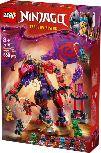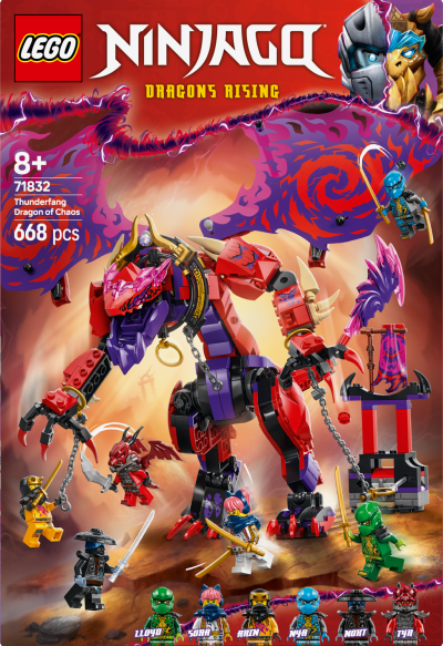 Se stavebnicí Drak chaosu Thunderfang si kluci a holky od 8 let připomenou scény z 3. řady televizního seriálu NINJAGO Dračí povstání Tento velký drak má pohyblivý ocas, nohy, křídla, chodidla, hlavu a čelist a pod oběma křídly najdete vystřelovač Drak chaosu Thunderfang je pomocí řetězů připevněn k menšímu modelu a lze ho uvolnit odemknutím 2 prizmatickými čepelemi 6 minifigurek NINJAGO – obsahuje nindža válečníky Lloyda,Nyu, Arina a Soru a Nokta a Tyra, který je vůdcem dračích stvoření, takže si děti můžou zinscenovat bitvy dobra proti zlu