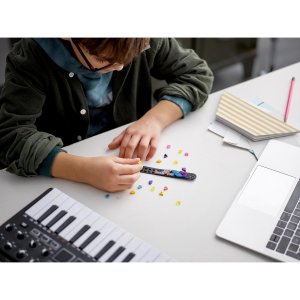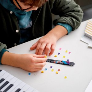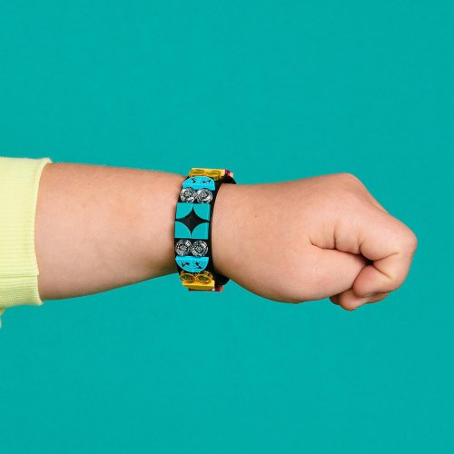 Hudební nadšenci budou sadu Náramek – disko trysko (41933) od LEGO® DOTS jednoduše zbožňovat! Kreativní sada obsahuje kvalitní tenký pásek v černé barvě, který obepne velká i malá zápěstí, a 32 barevných zdobítek, včetně speciálních kulatých dílků s hudebními motivy. Náramky umožňují snadné, intuitivní sestavení, takže je děti mohou sladit se svým outfitem nebo náladou a učinit je jedinečnými.