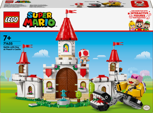 Se setem LEGO® Super Mario™ (71435) Bitva s Royem na hradě Peach se děti mohou těšit na hodiny objevování, bojování a přehrávání příběhů ze slavné lokality ze světa hry Super Mario™. Tento set s postavičkami Nintendo® představuje skvělý dárek pro holky, kluky a milovníky videoher od 7 let a součástí je model hradu princezny z kostek LEGO, který lze otevřít pro snadnější přístup během herních dobrodružství. Má snadno přestavitelné zdi, které se při obléhání rozpadnou, věž, katapult, otočný trůn a fontánu na zahradě. Součástí jsou také 3 figurky LEGO Super Mario: Roy (poprvé v setu LEGO Super Mario), Chain Chomp a Toad. Přidejte figurku LEGO® Mario™, LEGO® Luigi™ nebo LEGO® Peach™ (nejsou součástí balení) a užijte si interaktivní hraní. Pomozte jim porazit Roye a převzít kontrolu nad jeho Chain Chompem, najděte skryté akční prvky a odemkněte digitální reakce, jako je klavírní hudba. Návod na stavění najdete v krabici a v aplikaci LEGO Super Mario, která je navíc plná kreativních nápadů na stavění a hraní.