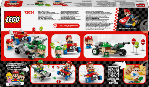 Vychutnejte si akční praskání balónků a závodění se setem Baby Mario vs. Baby Luigi (72034) pro děti. Tento zábavný narozeninový dárek Mario Kart™ pro kluky, holky a gamery od 8 let obsahuje 2 sběratelské figurky Nintendo® – Baby Maria a Baby Luigiho – a jejich vozidla Biddybuggy a Tri-Speeder. Obě sestavitelná vozidla střílejí krunýře – můžete mířit na 6 sestavitelných balónků (3 červené, 3 zelené). Komu se povede převrhnout balónky jako první? Umístěte figurku LEGO® Mario™, LEGO® Luigi™ nebo LEGO® Peach™ (ze setů 71439, 71440 nebo 71441 – prodávají se samostatně) do jedné z motokár pro interaktivní hraní, čímž se spustí zvukové a vizuální efekty Mario Kart, včetně zvuku pro start závodu, troubení a driftování. Návod na stavění pro tento set Nintendo najdete v krabici nebo v aplikaci LEGO® Super Mario™. Prohlédněte si i na další sety LEGO Super Mario: Mario Kart (prodávají se samostatně), se kterými můžete závodit a bojovat s dalšími postavami a vozidly.