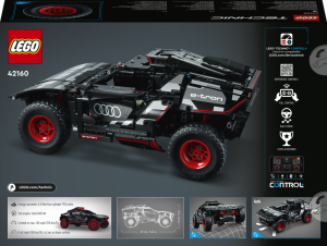 • Postavte „elektrické“ závodní auto – Děti od 10 let, které baví závodní auta, mají možnost objevovat nové technické dovednosti při stavění modelu závodního auta LEGO® Technic Audi RS Q e-tron 2022 z Rallye Paříž-Dakar • Funkce dálkového ovládání – S aplikací CONTROL+ si děti užijí testování jejich závodního auta na dálkové ovládání, se kterým mohou jezdit dopředu a dozadu a řídit ho • Věrné detaily – Stavebnice obsahuje mnoho vlastností skutečného závodního auta Audi RS Q e-tron včetně nového dílku volantu Technic vyrobeného speciálně pro tento model • Odpružení na 4 kolech – Stejně jako skutečné auto má i tento model nezávislé odpružení na každém ze 4 kol • Dárek pro děti od 10 let – Stavebnice LEGO® Technic (42160) Audi RS Q e-tron je skvělý nápad na dárek pro milovníky aut a fanoušky Audi • Rozměry – Tato stavebnice LEGO® Technic měří přes 15 cm na výšku, 37 cm na délku a 19 cm na šířku • Praktický pomocník – Objevte intuitivní návod v aplikaci LEGO® Builder, kde nadšení stavitelé mohou přibližovat a otáčet své modely ve 3D, sledovat postup a ukládat stavebnice. To jim pomůže v rozvoji nových dovedností • Úvod do světa techniky – Modely LEGO® Technic nabízejí realistické mechanismy a funkce pohybu, které uvedou mladé stavitele do světa inženýrství • Špičková kvalita – Dílky LEGO® Technic splňují ty nejpřísnější standardy a jsou konzistentní, kompatibilní a vždy dobře drží • Bezpečnost na prvním místě – Dílky LEGO® Technic pouštíme na zem, zahříváme, drtíme, kroutíme a analyzujeme, abychom zajistili, že vyhovují přísným globálním bezpečnostním standardům