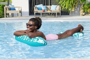 Lehátko Hamak je navrženo pro příjemné a odpočinkové chvíle ve vodě, a to díky své unikátní konstrukci, která umožňuje využití v několika režimech – jako lehátko, křesílko do vody, hamaku nebo sedlové sedátko. Základ tvoří pevná síťovina CoolDown™, která je příjemná na dotek a zároveň zajišťuje komfortní sezení či ležení ve vodě. Síťovina je chráněna potahem s květinovým vzorem v tyrkysové a bílé barvě, který zvyšuje odolnost lehátka proti poškození a zároveň přispívá k jeho atraktivnímu vzhledu.