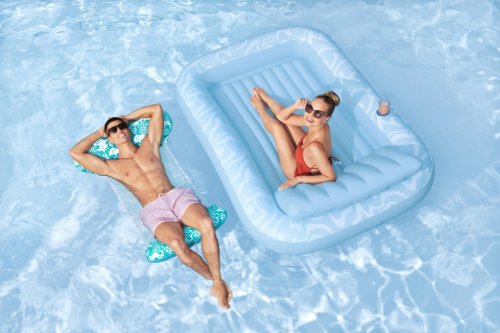 Nafukovací části lehátka, které slouží jako opěrky hlavy a nohou, jsou vyrobeny z měkkého a odolného vinylu s potiskem tropických květin, což podtrhuje letní a relaxační charakter produktu. Díky tomuto provedení lehátko nejen dobře plave, ale také poskytuje dostatečnou oporu a pohodlí při odpočinku. Ventily pro nafukování jsou snadno přístupné a umožňují rychlé a bezpečné nahuštění i vyfouknutí produktu. Nosnost lehátka je 100 kg, což zajišťuje stabilitu a bezpečnost při použití.