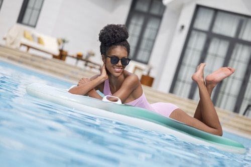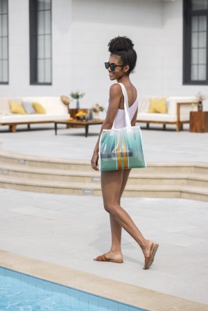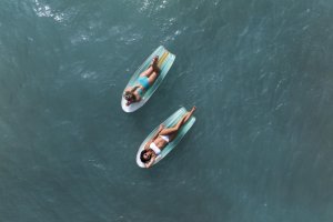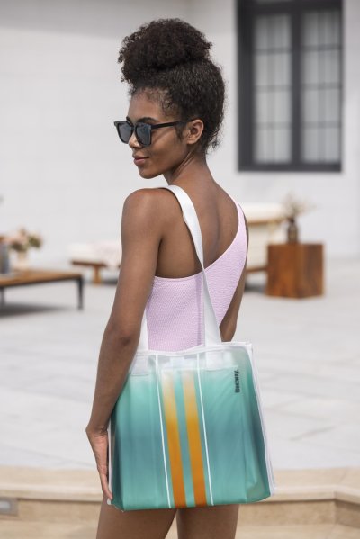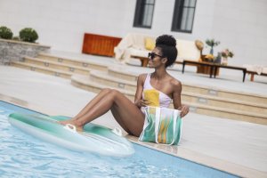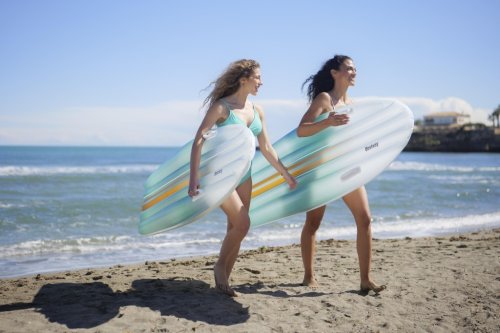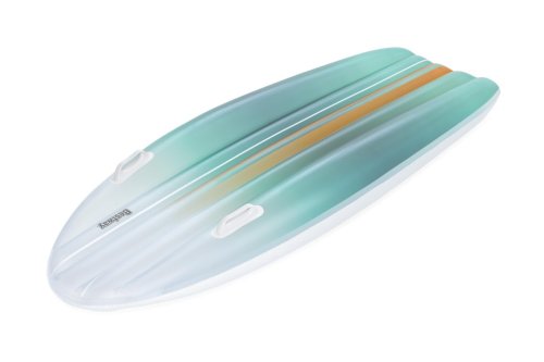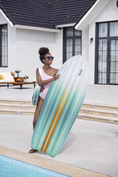 Lehátko nafukovací Tahiti tote 2 v 1 je praktickým a stylovým doplňkem pro relaxaci na vodě či u bazénu. Toto lehátko má rozměry 183 × 71 cm, což poskytuje dostatek prostoru pro pohodlné ležení. Je vyrobeno z kvalitního PVC materiálu, který je odolný vůči vodě a mechanickému poškození, což zaručuje dlouhou životnost produktu. Povrch lehátka je zbarvený do jemných pastelových odstínů modré, zelené a žluté, které vytváří příjemný vizuální efekt připomínající mořské vlny. Na bocích lehátka jsou umístěny dvě pevné a odolné rukojeti, které usnadňují manipulaci a nesení.