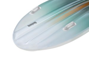 Design lehátka je ergonomicky tvarovaný se zvýšenými bočními okraji, které zajišťují stabilitu na vodní hladině. Povrch je rozdělený na tři nafukovací komory, což přispívá k lepší bezpečnosti a komfortu při ležení. Ventily pro nafukování jsou snadno přístupné a uzavíratelné, což umožňuje rychlé a pohodlné nafouknutí i vyfouknutí lehátka. Díky své nízké hmotnosti a kompaktním rozměrům po složení je lehátko ideální pro letní dovolenou, relaxaci u bazénu nebo pobyt u moře. Celkově jde o funkční a esteticky příjemný produkt, který splní očekávání milovníků vodní relaxace.
