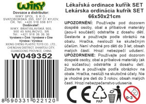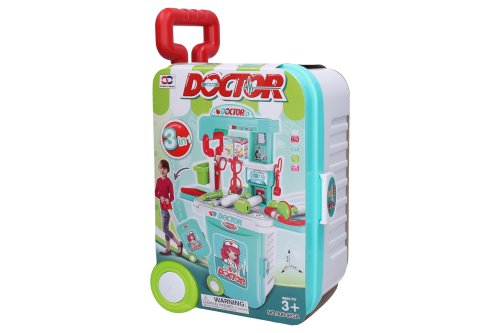 Lékařská ordinace v kufříku – skvělá hračka pro malé doktory. Kufřík na kolečkách s vysouvacím madlem (výška 55,5 cm, se zasunutým madlem 38 cm). Kufřík lze přestavět na ordinaci o rozměrech 66 x 50 x 21 cm. Součástí vybavení jsou brýle, nůžky, injekce, teploměr a další příslušenství. Rozměry balení: 24,2 x 37,7 x 17 cm. Věk: 3+