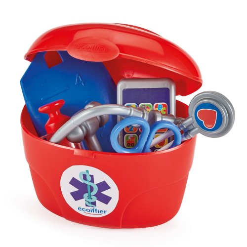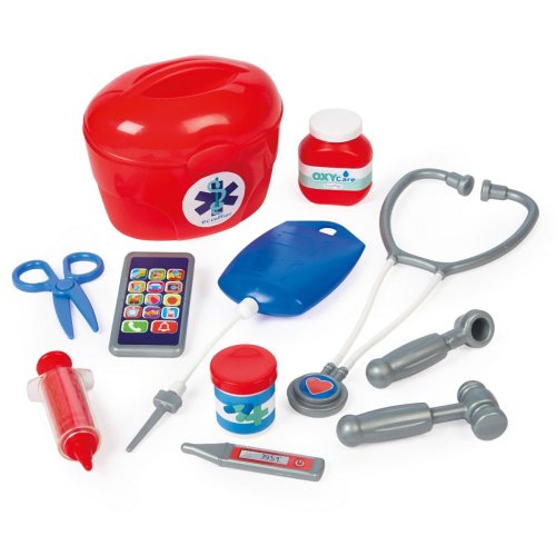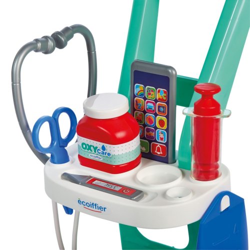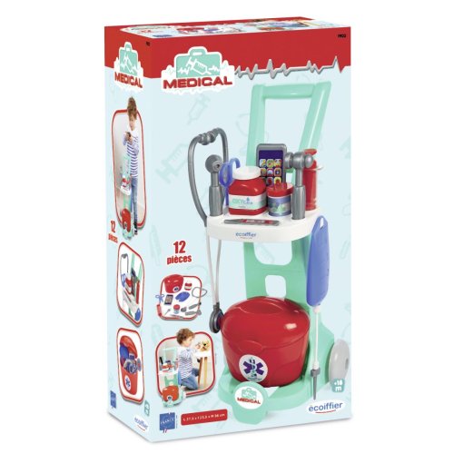 Vozík pro malé lékaře zahrnuje lékařský kufřík, stetoskop, infuzi a další příslušenství - stříkačku, teploměr, nůžky atd. pro zjištění zdravotního stavu pacienta. Výška vozíku je 56 cm. Hmotnost 1,085 kg.