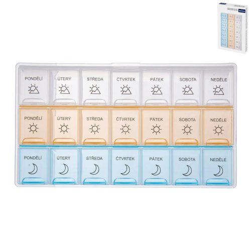 Dělený organizér na léky s CZ popisky na 7 dní je rozdělen na ranní, polední a večerní dávku léků. Do každé přihrádky si můžete připravit dávku léků na ráno, poledne a večer v daný den v týdnu. Každá přihrádka je opatřena průhledným zavíracím víčkem a označením názvu a částí daného dne. Ranní dávka má víčko bílé, polední oranžové a večerní modré. Materiál plast PP. Rozměry organizér 21.3 x 12 x 2.5 cm, jednotlivá část 3.3 x 2.8 x 1.7 cm. EAN 8592381226466