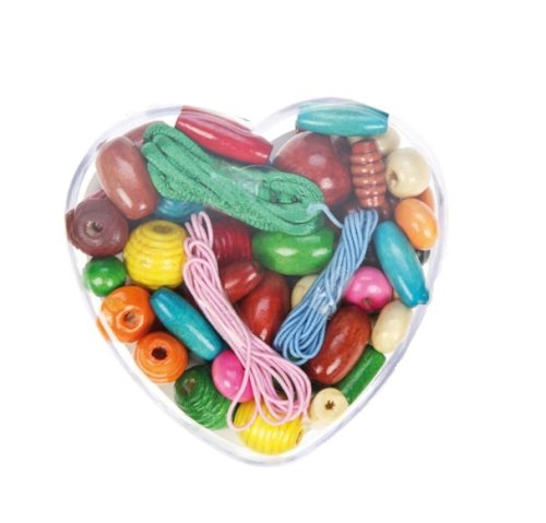 Dřevěné korálky různých barev a tvarů o velikosti 9,5 mm jsou umístěny v malém čirém srdíčku a doplněny o tři navlékací šňůrky. Hlavní vlastnosti: podporuje kreativitu a jemnou motorikupestrobarevné provedení