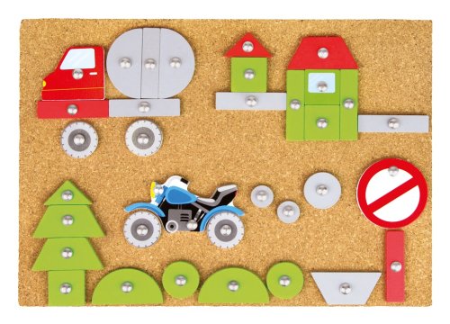 Tvůrčí zábava nikdy nekončí. S tímto kladívkem, dílky a korkovou deskou můžete vytvořit různé druhy dopravních prostředků. Sada obsahuje: 48 barevných dílků, 16 potištěných speciálních dílů, kladivo a hřebíky a korkovou desku: 27 x 20,5 cm. Hlavní vlastnosti: podporuje kreativitu a koncentracipodporuje jemnou motoriku