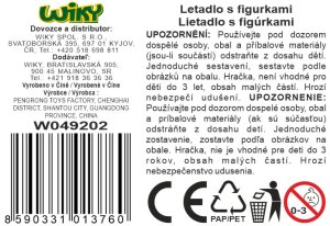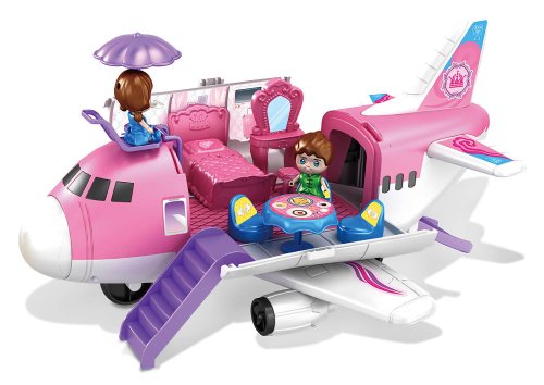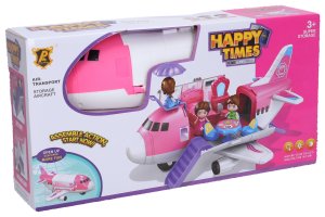 Letadlo s figurkami. Rozměry složeného letadla 34x28.5x17,5 cm. Obsahuje díly a nálepky k sestavení letadla, figurky, nábytek do letadla, obrázkový návod k sestavení na obalu. Bok letadla je otevírací.