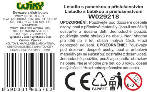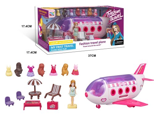 Letadlo s panenkou a příslušenstvím. Velikost letadla 28 cm. Balení obsahuje letadlo, panenku, zahradní nábytek s grilem, šaty a vlasy pro panenku.