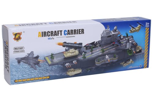 Letadlová loď s vozidly a vojáky set. Rozměry 47,5x21x14,5 cm. Návod na sestavení na obalu. Manuální pohyblivé prvky bez efektů.