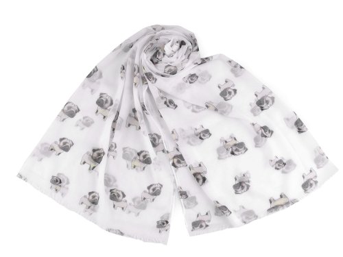 Šátek se vzorem pejsků je lehounký a vzdušný, velice příjemný na dotek. Je jemně průsvitný, na koncích má jemné třásně. Doladí váš outfit, ať už si vezmete sako, halenku, svetřík či šaty. Šátky mají špatné štítky, skutečné složení je 100% polyester. Omlouváme se za toto nedopatření a děkujeme za pochopení.