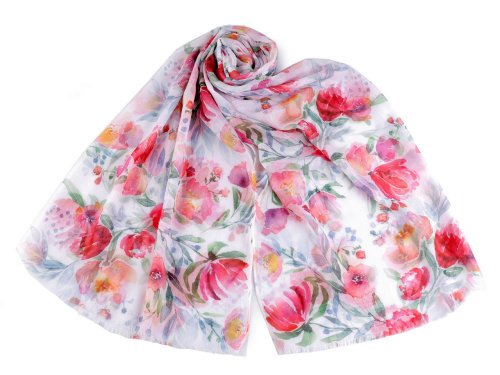 Šátek se vzorem barevných malovaných květů je lehounký a vzdušný, velice příjemný na dotek. Je jemně průsvitný, na koncích má jemné třásně. Doladí váš outfit, ať už si vezmete sako, halenku, svetřík či šaty. Šátky mají špatné štítky, skutečné složení je 100% polyester. Omlouváme se za toto nedopatření a děkujeme za pochopení.
