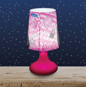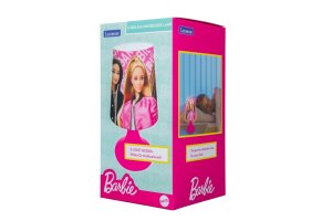 Stínidlo lampičky je potaženo látkou s barevným potiskem oblíbených panenek Barbie, které jsou zobrazeny ve výrazných růžových a černých bundách. Potisk je detailní a barevný, což lampičce dodává hravý a atraktivní vzhled. Na zadní straně stínidla jsou patrné motivy spojené s Barbie, jako jsou ikonické loga a doplňky, které ještě více podtrhují dětský charakter produktu.