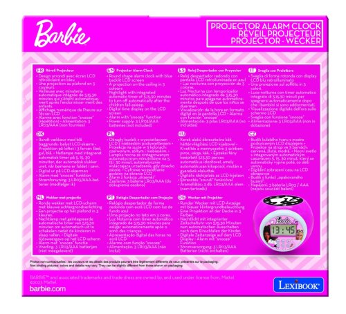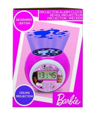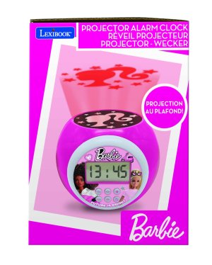 Lexibook budík Barbie se stropním projektorem je stylový a funkční budík určený především pro děti a fanoušky známé panenky Barbie. Jeho design je výrazně barevný, s růžovým kulatým tělem a modrým rámečkem kolem digitálního displeje, na kterém jsou vyobrazeny dvě postavičky Barbie. Budík má moderní digitální LCD displej ukazující čas ve 24hodinovém formátu. Ovládání je řešeno pomocí šesti kulatých tlačítek pod displejem, která umožňují nastavení času, alarmu, minut a hodin, stejně jako aktivaci projekce a dalších funkcí.