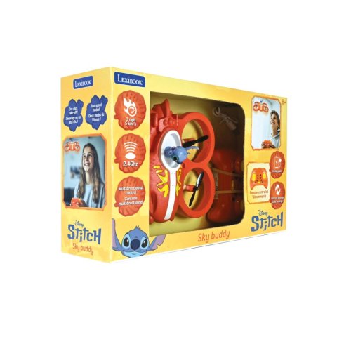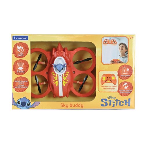Létající vesmírná loď na dálkové ovládání Lexibook s motivem oblíbené postavičky Stitch z Disneyho animovaného filmu představuje zábavnou a interaktivní hračku určenou dětem od 8 let. Tato čtyřrotorová dronová loď je navržena v jasné oranžové barvě s výraznými žlutými detaily, které jí dodávají futuristický vzhled. Na jejím vrchu sedí malá figurka Stitch, která hře dodává tematický charakter a zaujme všechny fanoušky této postavičky. Díky ochraně rotorů je dron bezpečný pro použití v interiéru i venku.