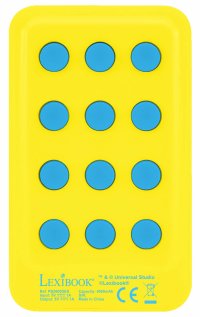 Na zadní straně power banky jsou umístěny modré přísavky, které umožňují snadné přichycení na hladký povrch, například na zadní stranu telefonu nebo jiného zařízení. Toto praktické řešení pomáhá udržet power banku stabilní během nabíjení bez nutnosti držení v ruce. Přísavky jsou dobře rozmístěné a pevně drží, což zvyšuje komfort používání. Na spodní části je také viditelné logo výrobce Lexibook spolu s technickými údaji, jako je vstupní a výstupní napětí (5 V, 1 A).