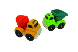 Sada obsahuje žluté auto s červeným míchačem betonu a zelené auto s modrozelenou korbou. Obě vozidla mají detailně propracovanou kabinu, kola jsou černá s bílými ráfky, což umocňuje realistický vzhled hraček. Povrch aut je matný a příjemný na dotek, což podporuje dětskou hru a manipulaci. Hračky jsou navrženy tak, aby podpořily rozvoj hrubé motoriky, koordinace ruky a oka a zároveň stimulovaly kreativitu a představivost předškolních dětí.
