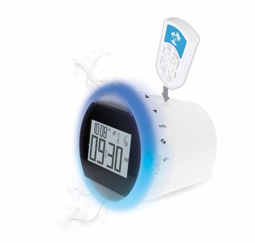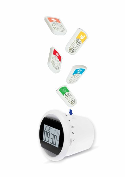 Unikátním prvkem tohoto produktu je integrovaná parfémová kapsle, která při zazvonění uvolňuje příjemnou vůni, čímž probouzení přináší i aromaterapeutický zážitek. Kapsle je snadno vyměnitelná a v balení je zahrnuta jedna parfémová kapsle s vůní označenou jako "Paradise". Navíc je možné vybírat z dalších vůní, které mají různá označení a barvy, což umožňuje uživatelům přizpůsobit svoji ranní rutinu podle nálady. Uvolňování vůně je doprovázeno jemným vyfukováním aromatických esencí, které je viditelné na ilustračních fotografiích produktu.