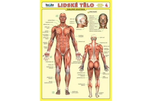 Přehledné anatomické nákresy orgánových soustav člověka (soustava svalová, kosterní, kožní, trávicí, vylučovací, dýchací, rozmnožovací, smyslová, nervová, oběhová, hormonální). Pomůcka vhodná pro studenty základních i středních škol.