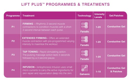 zpevnění -rytmické dvou sekundové stažení svalů pro získání kondice a krátké tří sekundové pauzy mezi jednotlivými pulsy, důkladné zpevnění – nabízí maximální procvičení svalů díky přednastavené variaci různé intenzity stahování, poklepávání – masážní stimulace svalů. Střídání 5ti sekundové masážní akce s tří sekundovou relaxací, intoforézní infuze – využívá slabý mikroproud k zapracování účinných látek hluboko do pokožky.