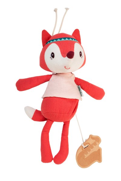 Textilní hračka pro děti již od narození. Liška Alice má uvnitř ukrytý hudební strojek. Rozměry hračky jsou 30 x 11 cm. Lze prát v pračce na 30°C na jemný cyklus po odebrání hudebního strojku a dřevěného nástroje. Použité materiály: 100% organická bavlna a FSC dřevo. Výplň hračky je 100% recyklovaný polyester (certifikace GRS).