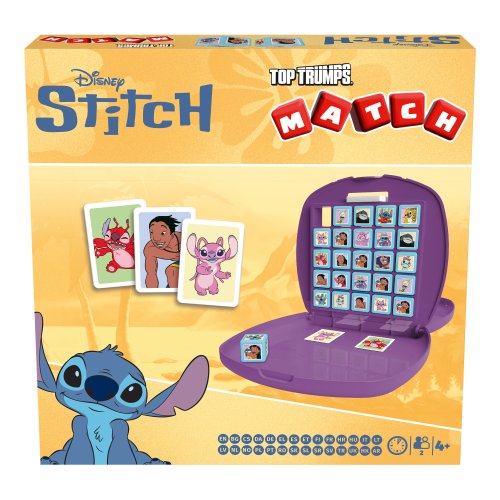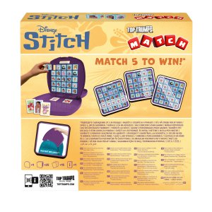 Lilo & Stitch Match desková hra. Desková hra pro 2 hráče. V plastovém kufříku na cesty. Snažte se uspořádat obrázky na kostičkách tak, abyste utvořili horizonální, vertikální, nebo diagonální řadu tvořenou ze stejných obrázků. Velikost rozloženého kufříku (herní plochy) - 41x26,5x20,8 cm.