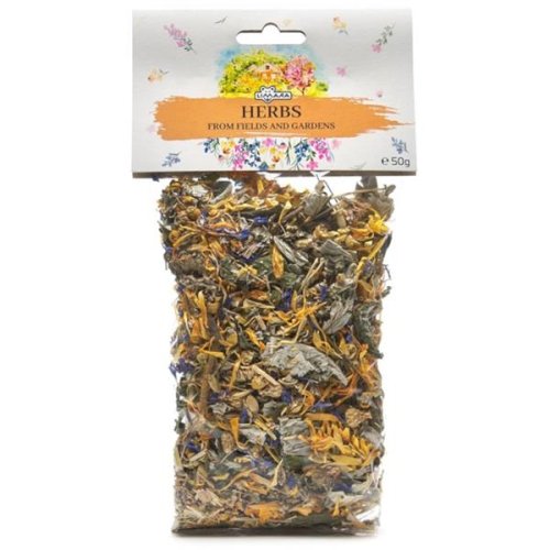 Bylinná směs pro králíky a drobné hlodavce obsahující bylinky z prostředí polí a zahrad, které jsou přirozenou součástí jídelníčku volně žijících druhů. Podporuje přirozenou obranyschopnost organismu a svojí strukturou pomáhá zvířatům přirozeně obrušovat zuby a též napomáhá lepšímu trávení a peristaltice střev. Složení: květ měsíčku, list maliníku, nať yzopu, květ heřmánku, nať dobromyslu, květ chrpy Krmný návod: Přidávejte denně ke krmné dávce nebo volně jako pamlsek. Množství přizpůsobte druhu, věku a zdravotní kondici zvířete. Bylinky je vhodné střídat s dalšími bylinnými směsmi Limara Herbs. Zajistěte nepřetržitý přístup k čerstvé pitné vodě.