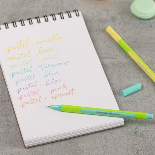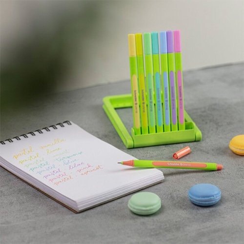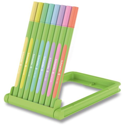 Barvy: pastel-limetková, pastel-vanilka, pastel-meruňka, pastel-lila, pastel-růžová, pastel-modrá, pastel-mint, pastel-tyrkys., [liner 0,4 mm][ergonomic 03], Oceněno světově nejznámější ekoznačkou „Modrý anděl“ za výrobu, která šetří zdroje a je šetrná k životnímu prostředí.