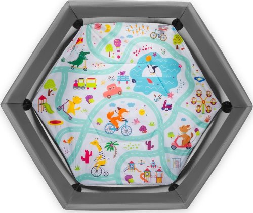 barevný povrch podporující rozvoj představivosti 6ti-hranný tvar ohrádky protiskluzové nášlapné podložky stabilní konstrukce potažená látkou odolnou proti nečistotám LockGuard proti nechtěnému složení součástí je i taška na přepravu možnost praní do 30°C ověřená kvalita certifikační laboratoří SGS