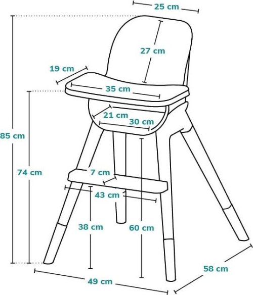 Nosnost: vysoká židlička: 15 kg, nízká židle: 30 kg. Rozměry: 49 x 58 x 60,85 cm. Celková hmotnost: 6 kg. Výrobek je v souladu s evropskou normou EN 14988.