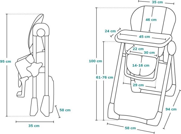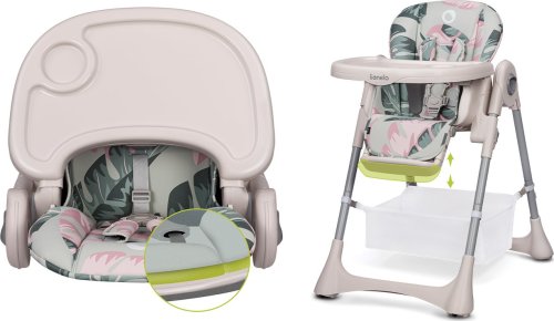odolný ocelový rám 4 úrovně nastavení výšky nastavení opěradla protiskluzové podložky na předních nohách zabraňují převrácení židle plastová kolečka na zadních nohách židle 5ti bodové bezpečnostní pásy dvoudílný nastavitelný podnos se speciálním místem pro šálek (odnímatelnou horní část lze mýt v myčce na nádobí) ergonomické sedadlo pohodlné měkké čalounění lze snadno čistit velký koš na příslušenství nebo hračky snadné a rychlé skládání, vhodná na cesty