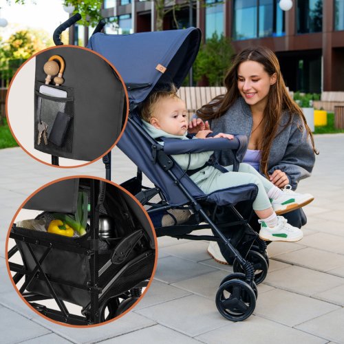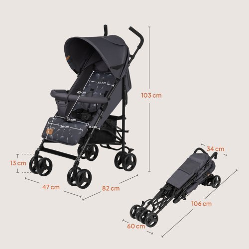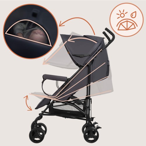 Stříška XXL se stříškou a okénkem: Zvětšená stříška lépe chrání dítě proti atmosférickým podmínkám a poskytuje příjemný stín. Přes okénko, které umožňuje nastavit proudění vzduchu, mohou rodiče pozorovat dítě. Lehký a kompaktní: Díky nízké hmotnosti a kompaktním rozměrům může být kočárek v rozloženém stavu vždy po ruce, když je potřeba. Bezúdržbová, nepropíchnutelná kola: Při cestě na dovolenou nebo při každodenních procházkách nemusíte mít obavy z foukání kol nebo jejich případného propíchnutí! Protože kola z EVA pěny nelze propíchnout. Odpružení a aretace otáčení: Přední kola jsou vybavena odpružením a aretací otáčení, která usnadňuje klidné houpání v přímém směru. Jednoduchý skládací systém: Stačí chvilka pro složení nebo rozložení kočárku. Obsluha je velmi jednoduchá a nezabere mnoho času. Pohodlné držadlo pro přenášení: Po bleskovém složení můžete lehký kočárek snadno přenést pomocí ergonomického držadla. Nastavení opěradla a opěrky nohou: 4 stupně nastavení opěradla a 2 úrovně nastavení opěrky nohou umožňují přizpůsobit kočárek aktuálním potřebám a výšce dítěte. Prostorný koš: Do snadno přístupného, otevřeného koše se vejde nákup nebo nejpotřebnější doplňky (včetně moskytiéry v sadě)