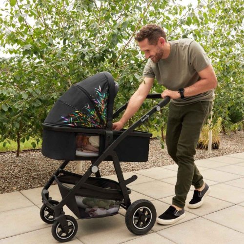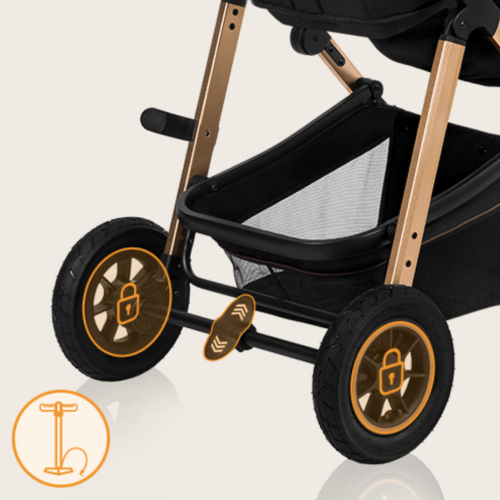 snadná montáž kočárku po i proti směru jízdy, lehký hliníkový rám, výškové nastavení rukojeti, nafukovací kola (přední: 18 cm, zadní: 23 cm) + brzda kol - dvojitý systém redukce vibrací, XXL stříška lemovaná materiálem odrážejícím UV záření chránící před sluncem, deštěm a větrem + okénko na zadní straně pro sledování dítěte, prostorná korbička s pevným madlem ke snadnému přenášení dítěte - po stranách jsou ventilační panely pro správnou cirkulaci vzduchu, kvalitní pohodlná matrace - potah lze sejmout a vyprat, nastavení polohy ve 3 úrovních, nastavení opěrky nohou ve 3 úrovních, prostorný koš, 5ti bodové pásy, snadné skládání do kompaktní velikosti díky "zacvaknutí", vyhovuje evropské bezpečnostní normě EN 1888.