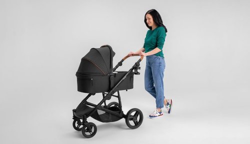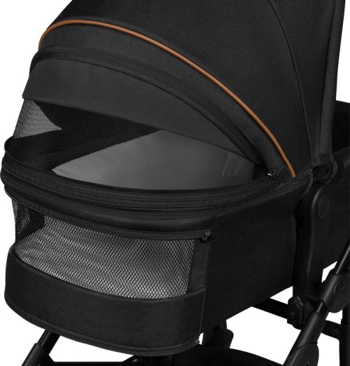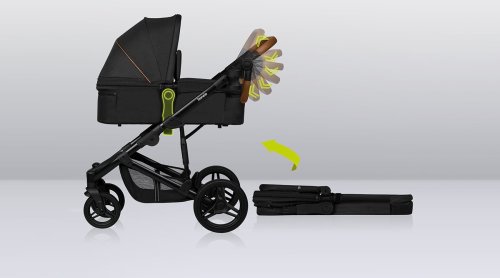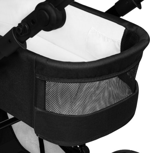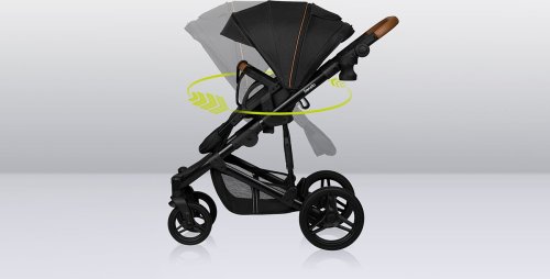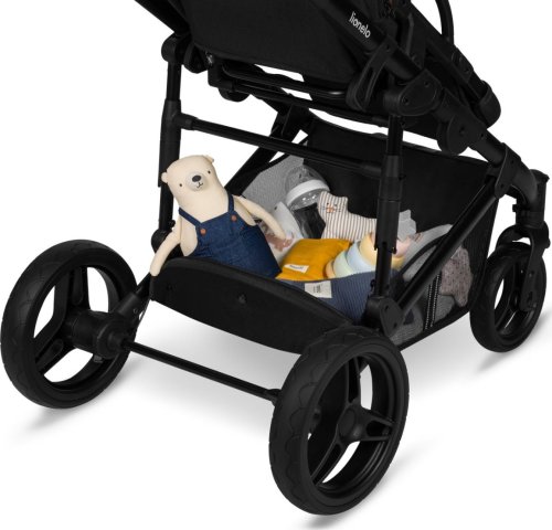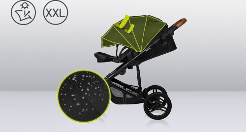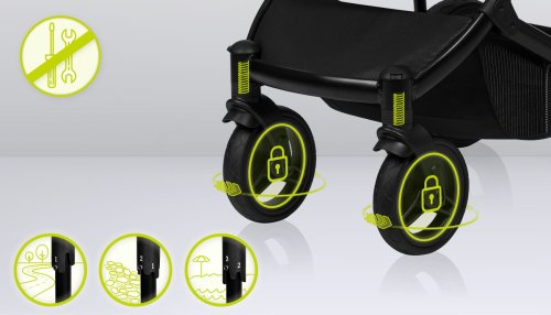 snadná montáž kočárku po směru a proti směru jízdy, bezúdržbová otočná o 360° terénní kola se vzorkem: přední 19 cm, zadní 27 cm, šířka 5 cm, aretace kol s přímým směrem jízdy, centrální tlumiče s nastavením stupňů tvrdosti, nepromokavá XXL stříška s UV50+ tkaninou se síťováním, prostorná korbička vhodná k přenášení dítěte, kvalitní pohodlná matrace s bavlněným potahem, nastavitelné opěradlo, nastavitelná opěrka nohou, 5ti bodové bezpečnostní pásy s polstrováním, odnímatelné dětské madlo, nastavitelná rodičovská rukojeť, prostorný koš ve spodní části kočárku s nosností až 3 kg, snadné skládání do kompaktních rozměrů, reflexní prvky, nánožník, pláštěnka (univerzální pro korbičku i kočárek), moskytiéra (univerzální pro korbičku i kočárek), držák na nápoje, přebalovací podložka, taška na příslušenství pro rodiče.