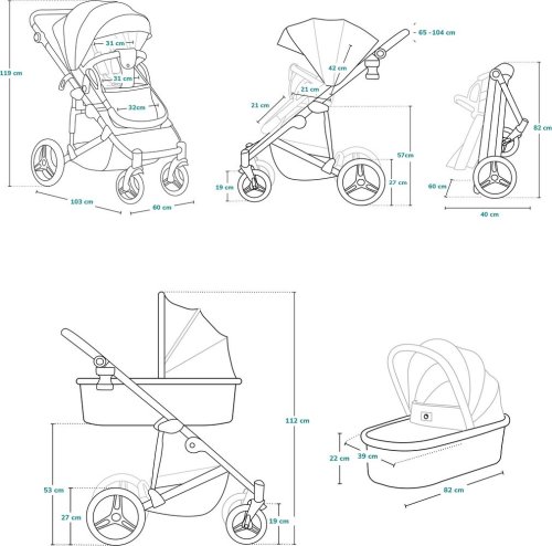 Technické údaje: Nosnost: hluboký kočárek 0-9 kg, sportovní kočárek 0-22 kg. Hmotnost hlubokého kočárku: 12 kg (korbička + rám) Hmotnost sportovního kočárku: 13 kg (sedadlo + rám) Rozměry s rámem: sportovní kočárek 103 x 60 x 119 cm, korbička 103 x 60 x 112 cm, složený sportovní kočárek 60 x 40 x 82 cm.