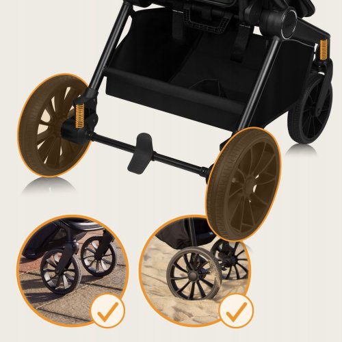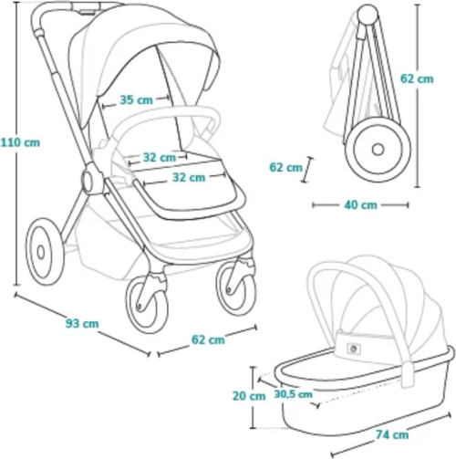 snadná montáž kočárku po směru a proti směru jízdy podle potřeb rodičů nebo dítěte, bezúdržbová terénní PU kola, aretace předních kol s přímým směrem jízdy, na vnitřní straně malá kapsa na dudlík a na vnější straně kapsa na telefon nebo klíče, adaptéry, které jsou součástí balení, jsou vybaveny paměťovou funkcí, 3D panoramatická ventilace umístěná na stříšce i na přední straně korbičky, inovativní matrace s technologií AiryDots, která díky speciálním větracím kanálkům zajišťuje neustálé proudění vzduchu, potah matrace je vyroben z přírodního materiálu - bavlny, pevný hliníkový rám, nižší těžiště, lepší stabilita, snadné manévrování, nepromokavá XXL stříška s UV50+ a voděodolnou vrstvou, prostorná korbička s pevným madlem ke snadnému přenášení dítěte, 3 stupňové nastavení sklonu opěradla, 4 úrovňové nastavení opěrky nohou z nepromokavé tkaniny vysoce odolné vůči znečištění, 5ti bodové bezpečnostní pásy s polstrováním, plné nastavení opěrky zad a opěrky nohou umožňuje rozložit sedačku do rovné polohy, možnost polohování do roviny, aby se zabránilo poklesu hlavičky během spánku, odnímatelné dětské madlo na obou stranách, 3 stupňové nastavení rodičovské rukojeti, prostorný koš ve spodní části kočárku s nosností až 3 kg, snadné skládání do kompaktních rozměrů, ramenní popruh na kočárek. nosnost: korbička 0-9 kg, sportovní kočárek 0-22 kg.