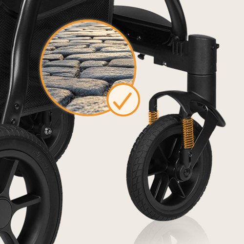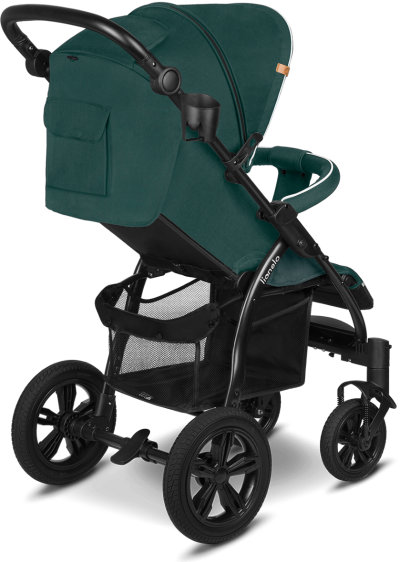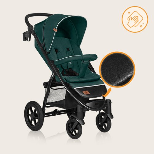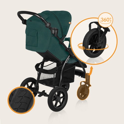 Také pro novorozence!: V kočárku lze bezpečně vozit děti ihned po narození! Sedadlo se dá složit naplocho (vznikne tak velký prostor dlouhý až 90 cm!) a speciální redukční vložka pro nejmenší děti zaručuje anatomicky správnou polohu, pohodlí a bezpečnost. Voděodolná boudička XXL s filtrem UPF50+: Zajišťuje dítěti dostatek místa a účinně chrání proti slunci, větru nebo dešti. Má přídavný, rozepínatelný panel, kukátko a reflexní prvky. UPF50+ je nejsilnější protisluneční filtr nasazovaný na tkaniny. Velká, bezúdržbová kola: Jsou vyrobena z polyuretanu, kombinují jízdní komfort s odolností. Je to materiál, který se prakticky neopotřebovává. Jsou protektorovaná a umožní vám pohodlnou procházku v každém terénu, nepropichují se a není třeba je foukat. Přední kola se otáčejí o 360°. Velmi dobré odpružení: Je to kočárek, se kterým nebudete cítit každý kámen na cestě – právě naopak. Nezávislé odpružení předních a zadních kol přispívá k tomu, že dítě (a jeho rodiče) pociťuje o mnoho méně otřesů a procházka je pohodlná. Jednoduché udržování čistoty: Opěrka nohou je potažena ekokůží v místě, kde se obvykle nacházejí boty dítěte, aby bylo možné jednoduše odstranit veškeré nečistoty. Potah kočárku a koš můžete prát v ruce. Prostorný koš: Koš pod kočárkem je prostorný a snadno přístupný, díky čemuž se kočárek osvědčí při nákupech. Reflexní prvky a příslušenství: Reflexní prvky na opěrce nohou, madlu a stříšce výrazně zlepšují viditelnost na silnici a zvyšují tak bezpečnost. V sadě s kočárkem dostanete také moskytiéru, držák na hrnek, redukční vložku a ochranný potah na nohy. Vhodný také pro vyšší osoby: Rukojeť kočárku má až 9 stupňů nastavení, což umožňuje rodičům přizpůsobit její polohu své výšce, aby procházka byla pohodlnější a zdravější pro páteř.